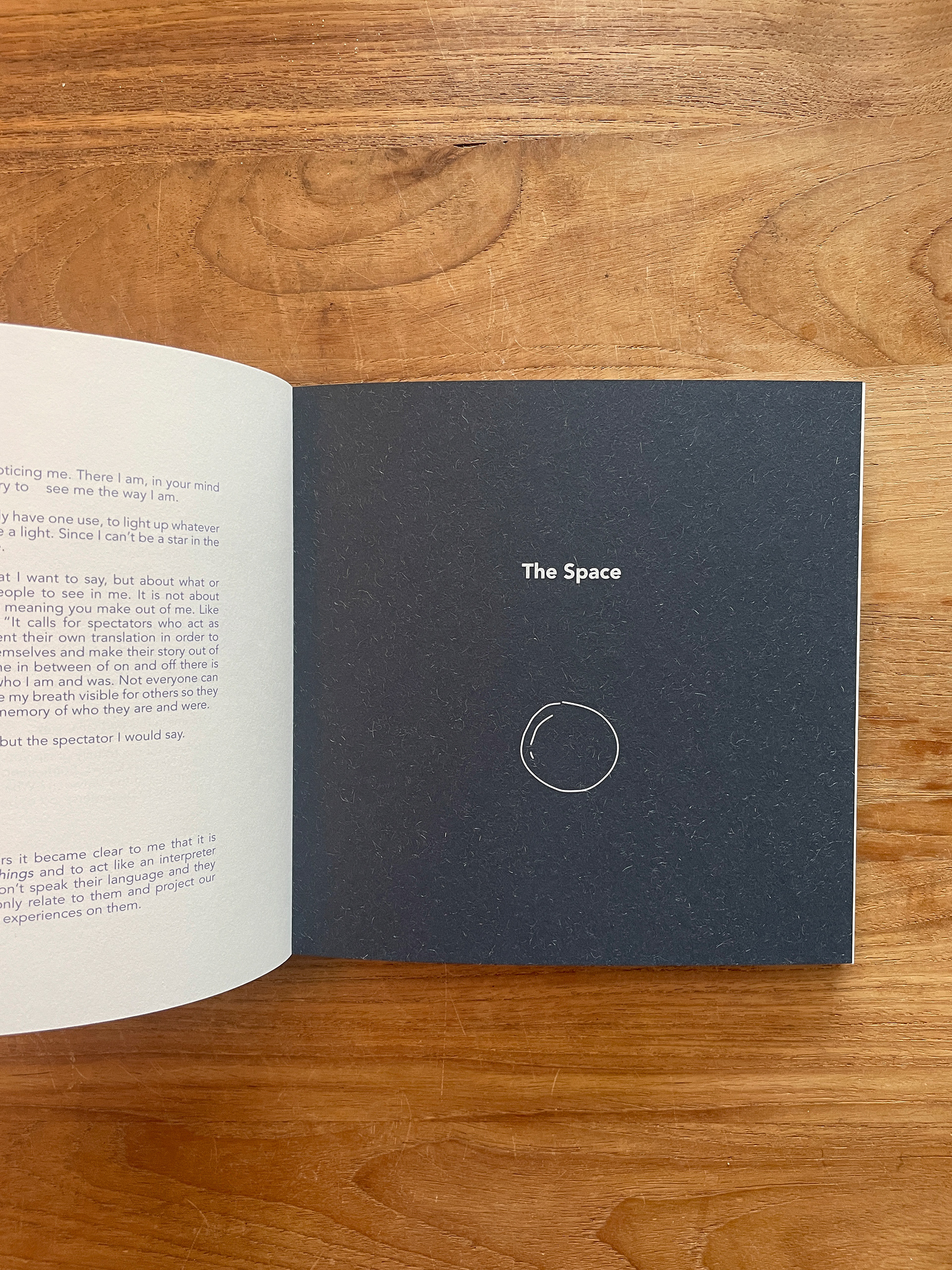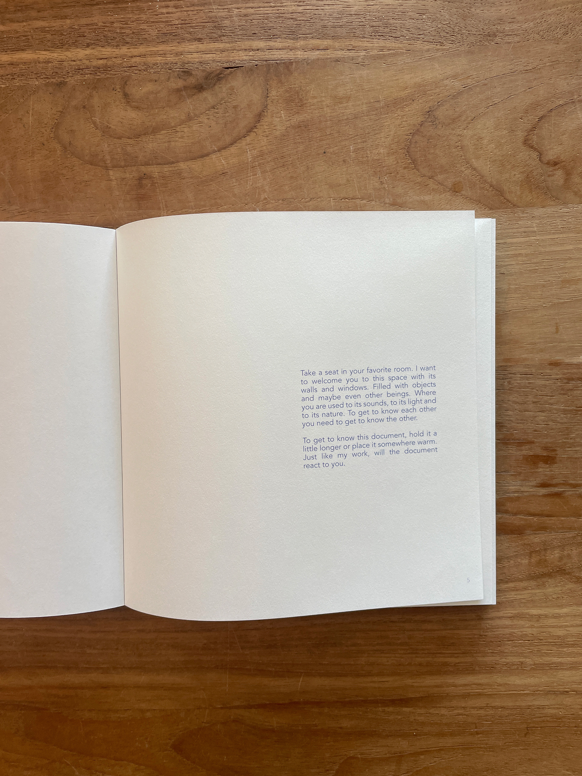 Afstudeerscriptie Ma Scenography Bij de vormgeving van mijn scriptie heb ik gezocht naar een manier om de inhoud op een innovatieve wijze te presenteren. De buitenkant van de scriptie is bekleed met thermische verf, die reageert op de aanraking van degene die het vastheeft. Dit is onderdeel van een lopend onderzoek naar de levendigheid van materialen en objecten. Ik gebruik objecten als een poppenspeler, om te ontdekken welke theatrale werelden en bewegingen zich daarin verschuilen.