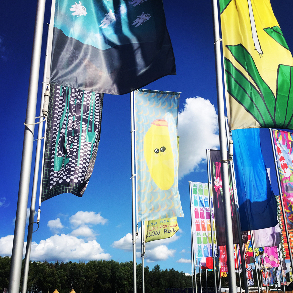 Lowlands heeft ieder jaar een wedstrijd om een vlag te ontwerpen. De beste komen in het vlaggenwoud te staan en keren ieder jaar terug. Mijn ontwerp is gebaseerd op de nachtelijke avonturen en het gebrek aan vitamines na zoveel dagen op een festival.